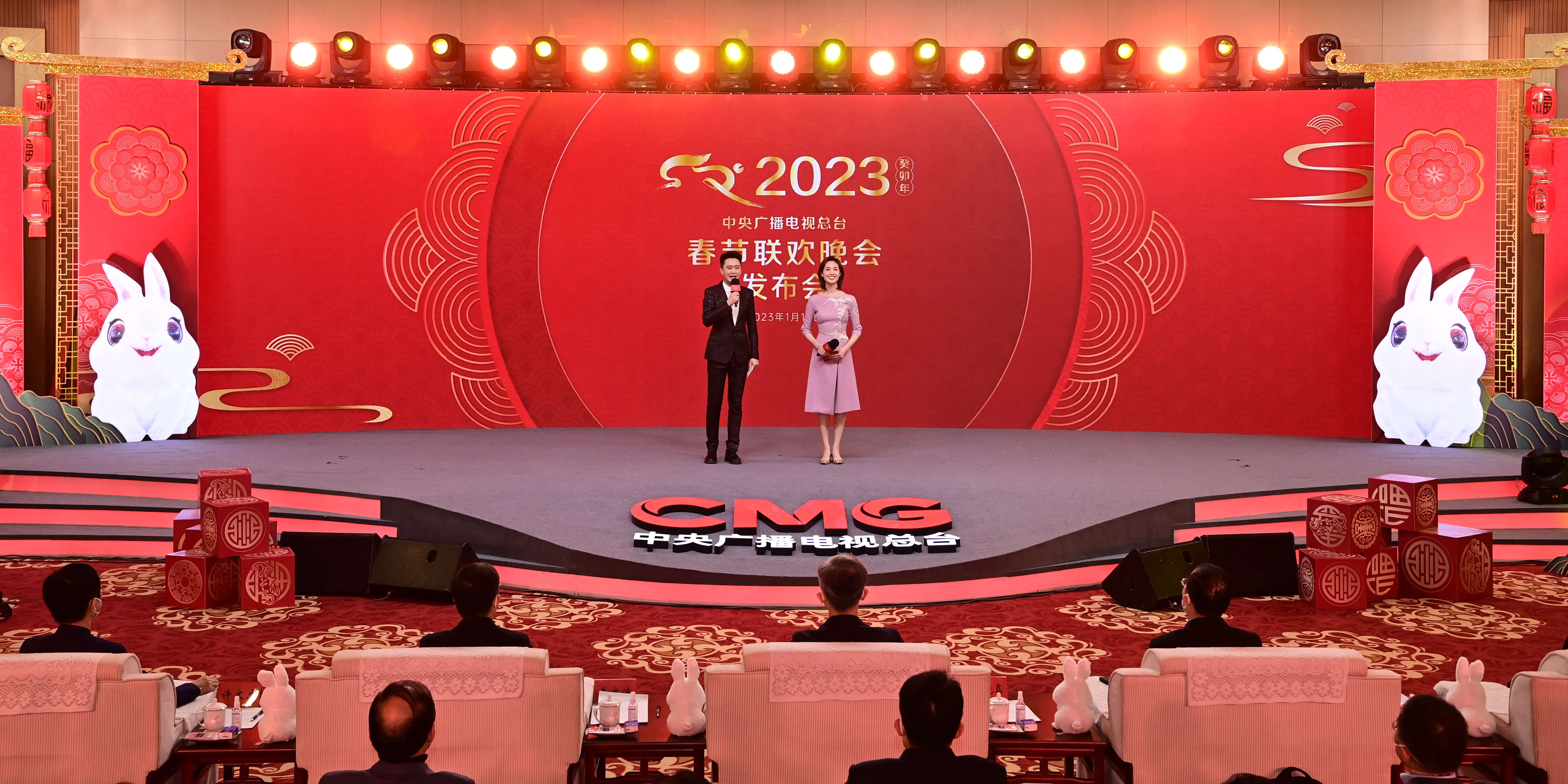 1月16日,中央广播电视总台《2023年春节联欢晚会》举行新闻发布会,介绍多项技术创新亮点,官宣主持人阵容,并首次发布春晚舞美宣传片和吉祥物“兔圆圆”动画短片。中央广播电视总台副台长王晓真参加发布会。