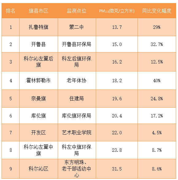 备注:科尔沁区和开发区为国控点位数据、其余7个 旗县(市、区)为区控点位数据;污染物的监测状态按照《环境空气质量标准》(GB3095-2012)修改单(生态环境部公告 2018年第29号)中的相关要求执行;PM2.5 浓度统计扣除沙尘天气影响,优良天数比例统计保留沙尘天气影响;环境空气质量综合指数越小,环境空气质量越好;反之,越差。