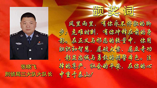 当同事夸奖张晓飞的成绩斐然时,他始终牢记初心,不忘使命,总是一如既往的投入到他热爱的刑侦工作。“赴汤蹈火为人民、恪尽职守保平安”。在平凡岗位的背后,凝聚着多少不为人知的生死较量和工作艰辛。张晓飞面对社会最阴暗的角落,经受着常人难以忍耐的心理压力。在这片战场上,始终作为“尖刀”战斗在奈曼刑侦工作第一线,他用忠诚奉献践行着人民警察的铮铮誓言,他用血与汗诠释了人民警察的价值追求,他用披肝沥胆抒写着人民警察爱人民的为民情怀。
