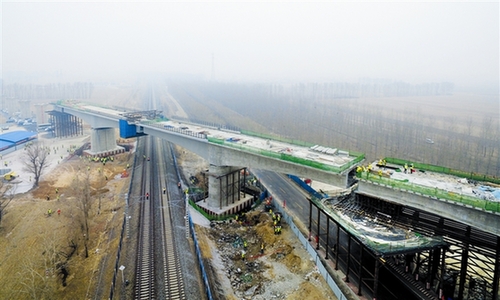3月17日,由中铁十四局集团参建的国家重点铁路项目——通辽至辽宁新民北高铁全线首座转体桥成功转体,同时跨越304国道和大郑铁路,实现了“完美转身”,成为全线4座转体桥中首座成功转体的桥梁,标志着内蒙古连接东北地区的首条高铁建设取得阶段性突破。