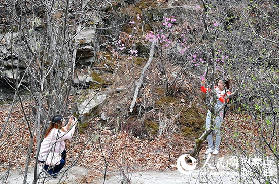 在漫山遍野的杜鹃花里游客拍照留念