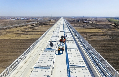 4月11日,中铁三局京沈高铁12标段施工人员进行轨道板铺设作业。