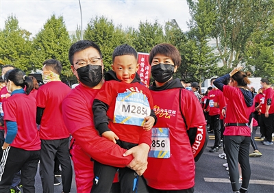 本次赛事不仅设有全程马拉松、10公里健康跑,还设置了3.6公里的迷你马拉松,因而吸引了不少夫妻档、家庭档参与。赵辉一家三口在迷你组区域等待开跑,4岁的儿子显得很兴奋。赵辉说:“得知在家门口举办马拉松赛,第一时间就给全家报了名。带孩子过来,主要就是想让他感受气氛,明白做什么事情都要懂得坚持。”