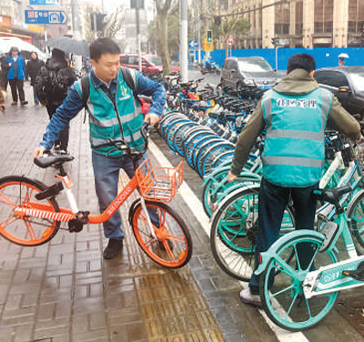 巨云鹏(左)与姜晓辰一起整理人行道上的共享单车。