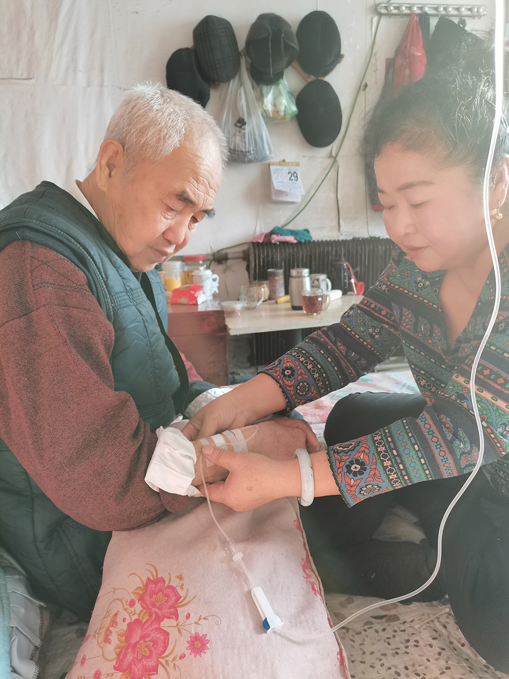 天有不测风云,2019年9月,李玉杰的公公因交通事故头部重伤昏迷不醒陷入植物人状态。住院期间李玉杰坚强地扛起护理的重任,遵照医嘱给插着鼻饲管的公公打流食、翻身、按摩、擦洗。经过近两个月的救治,等来的却是老人已无治愈醒来可能的消息,院方要求出院。将公公接回家后,李玉杰为了给老人增加营养,每天大清早去买来新鲜水果、肉,和米汤在一起搅拌成糊糊,用针管打进公公的鼻饲管里,一天要打七八次,每次都要半个多小时。因为老人身上任何知觉,为了防止肌肉萎缩,两个小时要翻一次身,一天最少要按摩两次,一次就要一个多小时。照顾植物人公公的将近一年里,还有数不清的辛苦劳累。即便这样,李玉杰和爱人依然坚持给老人最好的治疗和护理,有一线希望就决不放弃。