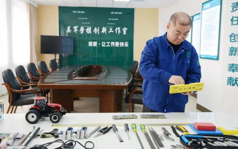 在科左后旗供电公司,有一个“吴军劳模创新工作室”,就是以他的名字命名的。整个创新团队由15名素质高、能力强、敢于创新的骨干人员组成,年可节约资金100多万元。在工作室,迎面可以看到一个工程机械模型。“这个我们起名叫‘挖坑立杆一体机’,是现在主攻的方向,已经开始试车,如果成功将大大缩减施工成本。”工作室的大部分空间都被工作台占据,上面摆放着许多工具。几张烫金的专利证书偏居一隅。
