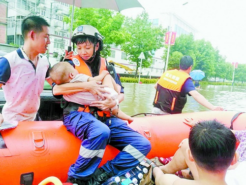 陈素珍带队救援洪灾时,将发高烧的孩子转移送医。(市委文明办供图)