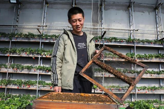 在张振阳家的草莓棚中,一只只蜜蜂飞来飞去。张振阳欣喜地说,这些“雇”来的蜜蜂不是为了采蜜,而是来给草莓花授粉的。一直以来,由于通风问题,大棚内的草莓花难以授粉,如今每个棚放置两个箱蜂,这一问题迎刃而解。