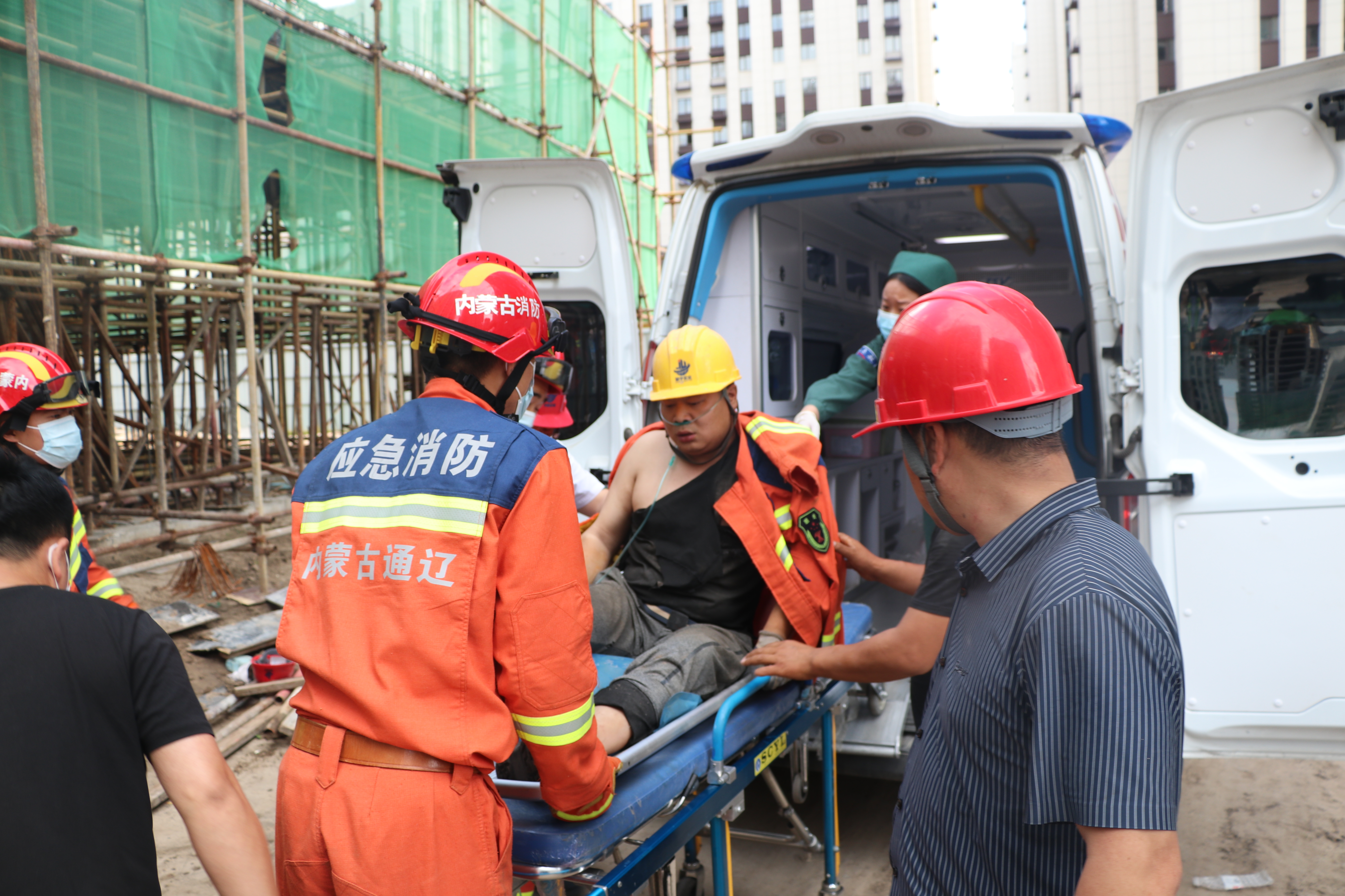 通辽市消防救援支队青龙山街特勤消防站救援人员赶到现场时看到,受伤工人正坐在地上,长约1米多的钢筋从右侧腋下刺入直到左侧胸部,但是并未刺穿。此时工人意识清醒,消防救援人员在医护人员的指导下,在距离工人身体40厘米处,边用矿泉水降温边使用角磨机将钢筋截断。经过10分钟的救援,钢筋被截断,众人合力将受伤工人抬上救护车。