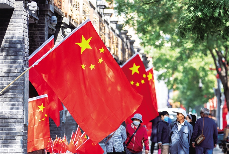 国庆临近,呼和浩特市街头巷尾纷纷悬挂起五星红旗,喜迎节日的气息扑面而来。草原全媒·正北方网记者 牛天甲 摄