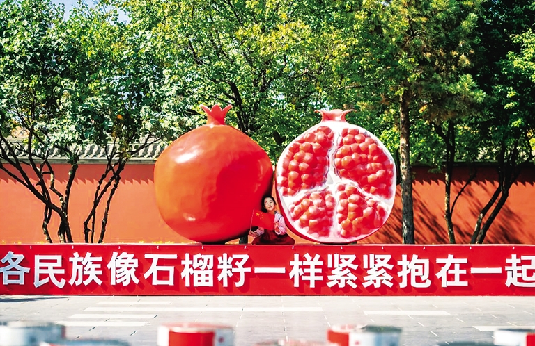 9月27日,一位小朋友手持国旗在呼和浩特市玉泉区塞上老街区块与“各民族像石榴籽一样紧紧抱在一起”景观造型合影。随着国庆节的临近,呼和浩特市玉泉区的大街小巷、旅游景区等地纷纷悬挂起五星红旗,处处洋溢着热烈、喜庆的节日氛围。丁根厚 摄