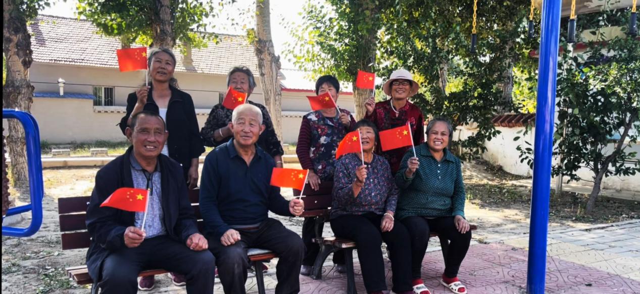 幸福大院的老人,手里挥舞着红旗,祝福祖国国泰民安。(摄影:赵欣楠)