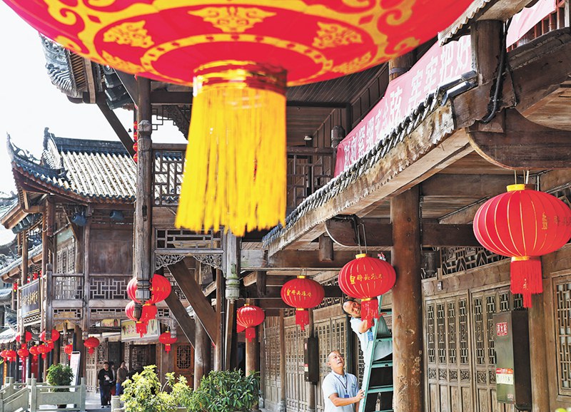国庆将至,濯水景区工作人员忙着张灯结彩,营造节日氛围,喜迎佳节。