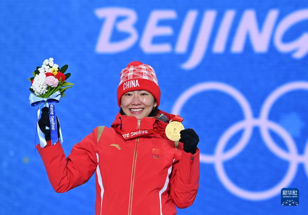 徐梦桃在张家口云顶滑雪公园举行的北京2022年冬奥会自由式滑雪女子空中技巧决赛夺冠后庆祝(2022年2月14日摄)。新华社记者 吴壮 摄