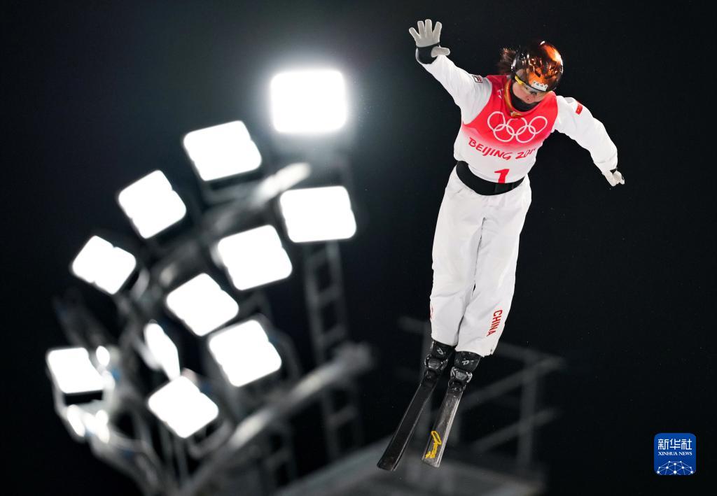 徐梦桃在张家口云顶滑雪公园举行的北京2022年冬奥会自由式滑雪女子空中技巧决赛中(2022年2月14日摄)。新华社记者 牟宇 摄