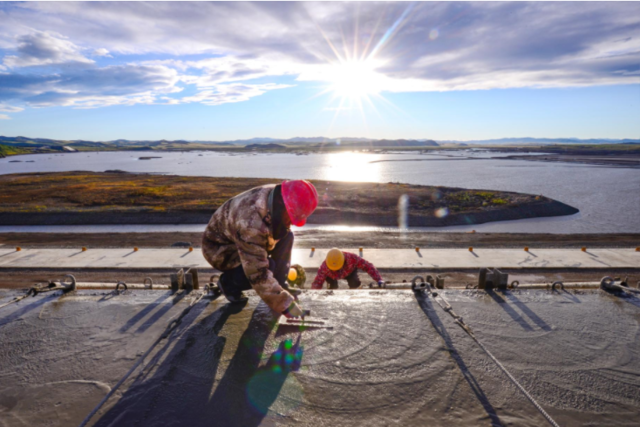 工人在文得根水利枢纽大坝上游进行护坡混凝土浇筑。 张启民 摄