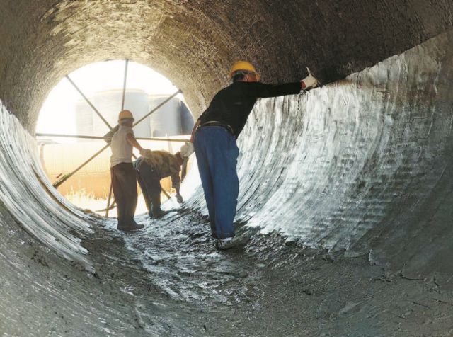工人在韩建河山对PCCP管配件进行砂浆衬砌处理。韩学文 摄