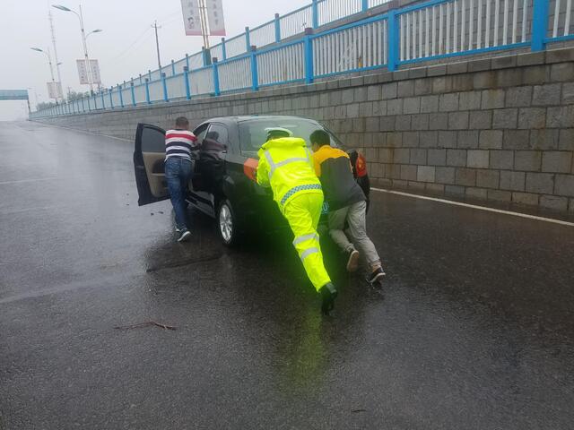 降雨期间,执勤民警冒雨在城区各路口加大疏导力度,清除路面障碍,严防发生因积水引发的车辆熄火、交通堵塞现象。在易积水的铁路涵洞、立交桥、路段等处,利用巡逻警车、喊话器提醒过往车辆注意绕行,防止车辆涉水交通事故发生。支队122指挥中心通过视频巡查易积水路段,动态掌握道路通行情况,快速做出反应。与此同时,支队通过广播、微博、微信、短信等媒体进行交通安全宣传,及时发布雨天出行交通安全提示信息,引导广大交通参与者安全出行。