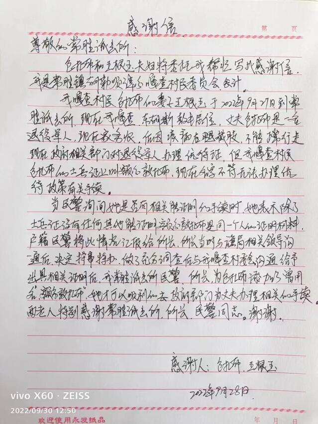 包扎布是常胜镇辖区居住的一名退役军人,现在家务农,因疾病右腿截肢,不能正常行走,他想办理退役军人优待证,但他所持的士兵证上叫额尔敦扎布,与现名字不符,又拿不出其它能证明与“额尔敦扎布”是同一个人的证明材料,无法办理优待政策有关手续。常胜镇派出所所长与后旗局相关领导沟通后决定特事特办,经详细核查,与其居住的所在地嘎查村委会沟通后给予出具相关证明,这样,常胜镇派出所为老人解决了一家人的忧心事。事后,常胜镇派出所收到了老人送来的一封炽热的感谢信。信中以平实而动人的话语向派出所热情为群众服务,积极帮助群众分忧,切实为群众解难题的人民警察表示感谢。