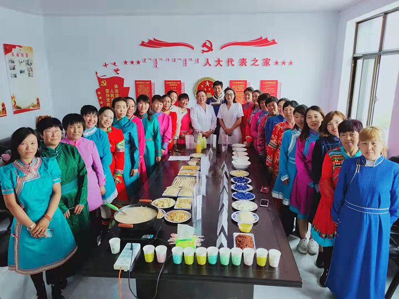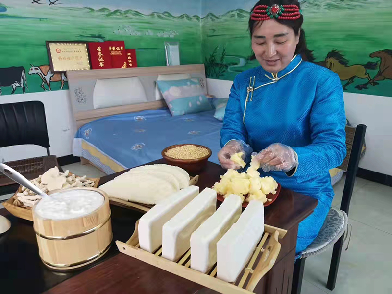 为了让家人过上好日子,她呕心沥血,向经验者求学,到蒙古国进修,从2014年仅有1头奶牛卖5斤牛奶的农户发展成为如今拥有近80头奶牛能生产近1200斤牛奶的小企业。她也不忘回馈养育她的家乡,帮助带动村民一起发家致富,在当地政府的组织下,为全苏木各嘎查村免费培训制作各种奶食品,真正地将自己的小情发扬成大爱。