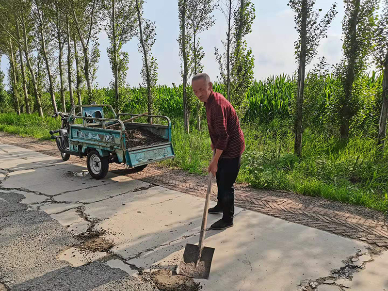 退休后,张景武发现东喜村村内及周边道路破损严重,影响家长接送学生以及村民日常出行后,便积极投入到无偿修补村内及周边道路的志愿服务中。老人的家境并不富裕,老两口靠着微薄的工资和几亩田地养活着一家老小。即使生活再艰难,也没能磨灭张景武老人为人民服务的意志。不论严寒还是酷暑,张景武不是在修路,就是在捡拾修路材料的路上,从沙子泥土到砖头,从村口到垃圾场,每天一大早,张景武就会骑上他的电动三轮车,拉着工具和新捡的砖头,到村上修补道路。冬天时,他总是穿着件薄薄的棉服,戴着毛线手套,就算是三九天,也没换过,因为他每天都要弯腰修路数十次,如果穿得太厚,就会活动不便。修路的过程中,他先是用泥土垫在裂开的道路上,使过往车辆明显感受到道路不再像以前那么颠簸。但夏季雨水多,雨水会把垫在裂缝中的泥土带走,道路随即恢复原样。他又想到一个办法,找到合适的砖头垫在裂缝中,并用和好的水泥在上面覆盖一层,这样能有效缓解雨水冲刷加速路面破损的问题。因为过往车辆多,车速快,时常会有被车辆剐蹭的危险,呼啸而过的汽车常常把张景武惊出一身冷汗,有时候刚刚修好的路,就又被轧坏了。四年多,张景武付出了别人看不到的艰辛,将村内及村周边的路修了一遍又一遍,累计修复道路10000多延长米。