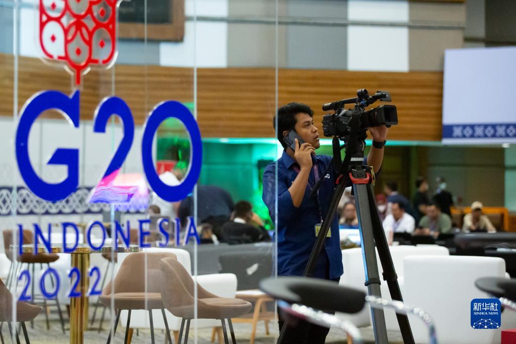 11月13日,媒体工作者在印度尼西亚巴厘岛的峰会媒体中心工作。