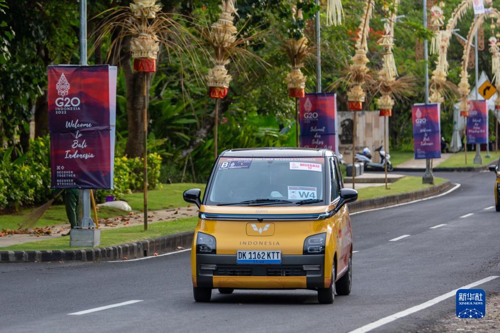 11月12日,峰会用车五菱新能源Air ev行驶在印度尼西亚巴厘岛的路上。