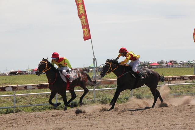 “那达慕”大会上有惊险刺激的赛马、摔跤,令人赞赏的射箭,有争强斗胜的棋艺,有引人入胜的歌舞。赛马是大会上绝对的主角。赛道上,骑手们一字排开,个个扎着彩色腰带,头缠彩巾,洋溢着青春的活力。赛马的起点和终点插着各种鲜艳的彩旗,只等号角长鸣,骑手们便纷纷飞身上鞍,扬鞭策马,一时红巾飞舞,如箭矢齐发。