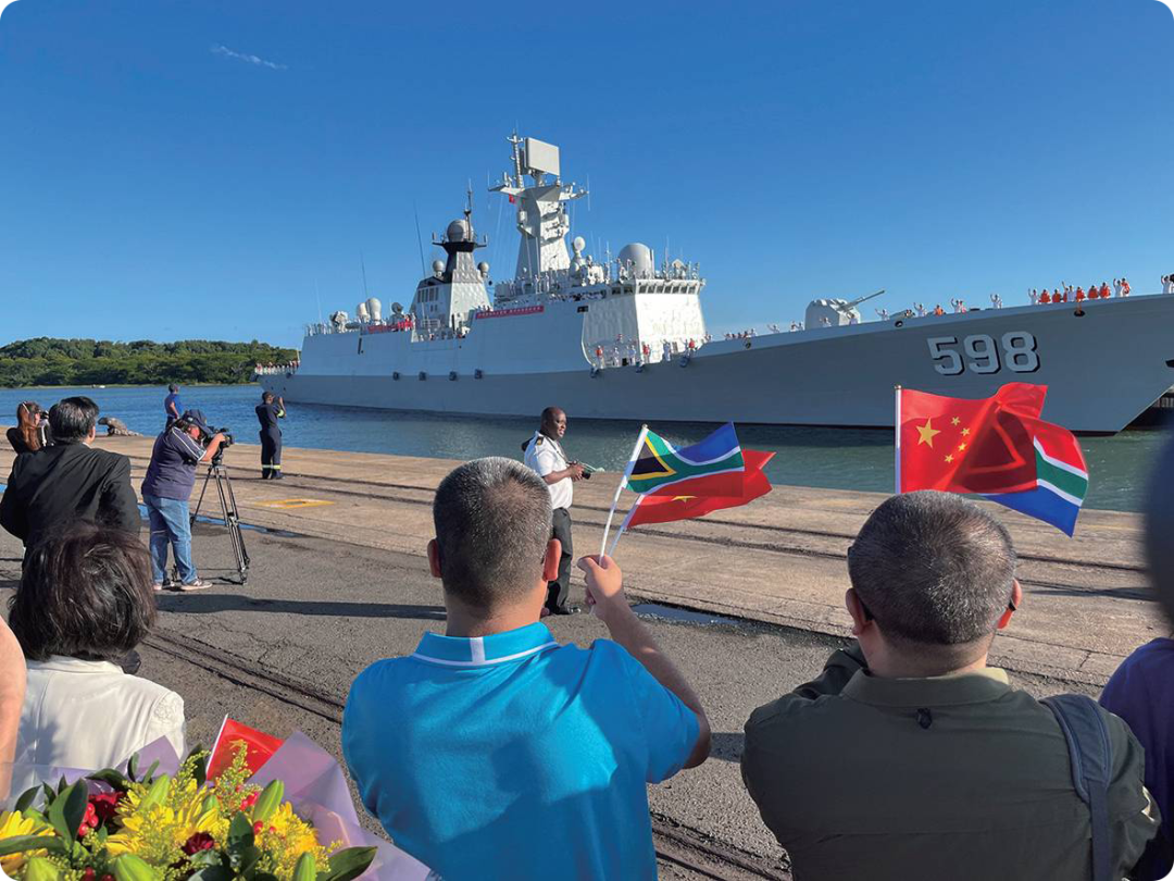 △联合演习开始前一天,中国海军日照舰抵达南非理查兹湾港口,受到欢迎