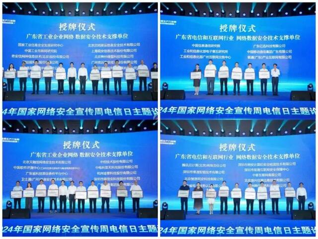 论坛期间,中国信息通信研究院、国家工业信息安全发展研究中心、中国电信、中国移动、中国联通、深圳云天励飞技术股份有限公司、中国太平洋财产保险股份有限公司、广东汇天航空航天科技有限公司等研究机构和企业相关负责人和专家,围绕网络安全产业发展、数字化转型、风险治理体系、AI安全、网络安全保险等作了主题演讲,广东省通信行业协会人工智能专业委员会、网络安全专业委员会、数据安全专业委员会正式成立,广东省电信和互联网行业网络数据安全技术支撑单位、广东省工业企业网络数据安全技术支撑单位正式授牌。