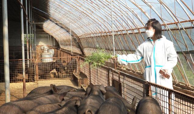 说起养殖经,梁晓萍可是滔滔不绝:“生态黑猪跟白猪饲养方式不同,喂养的东西也是不同的,我们养殖的黑猪60%以上吃的都是青贮,其余的20%吃的是玉米等粮食,剩下20%是以自己配方的中草药等。”