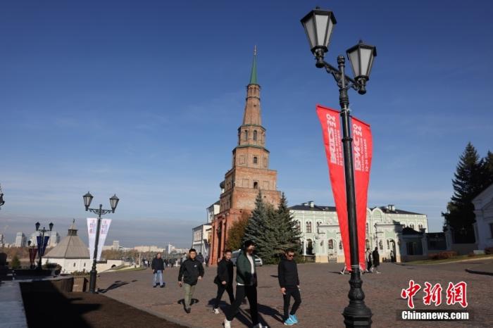 当地时间10月20日,俄罗斯喀山大街上悬挂着金砖峰会条幅。金砖国家领导人第十六次会晤将于2024年10月22日至24日在俄罗斯喀山举行。中新社记者 盛佳鹏 摄