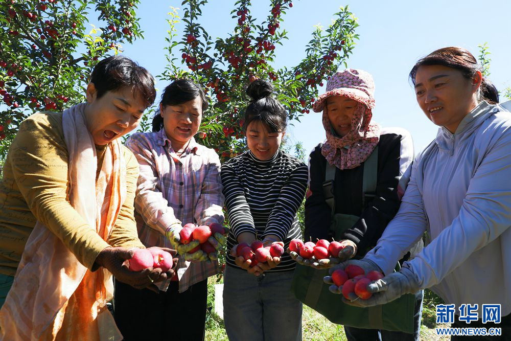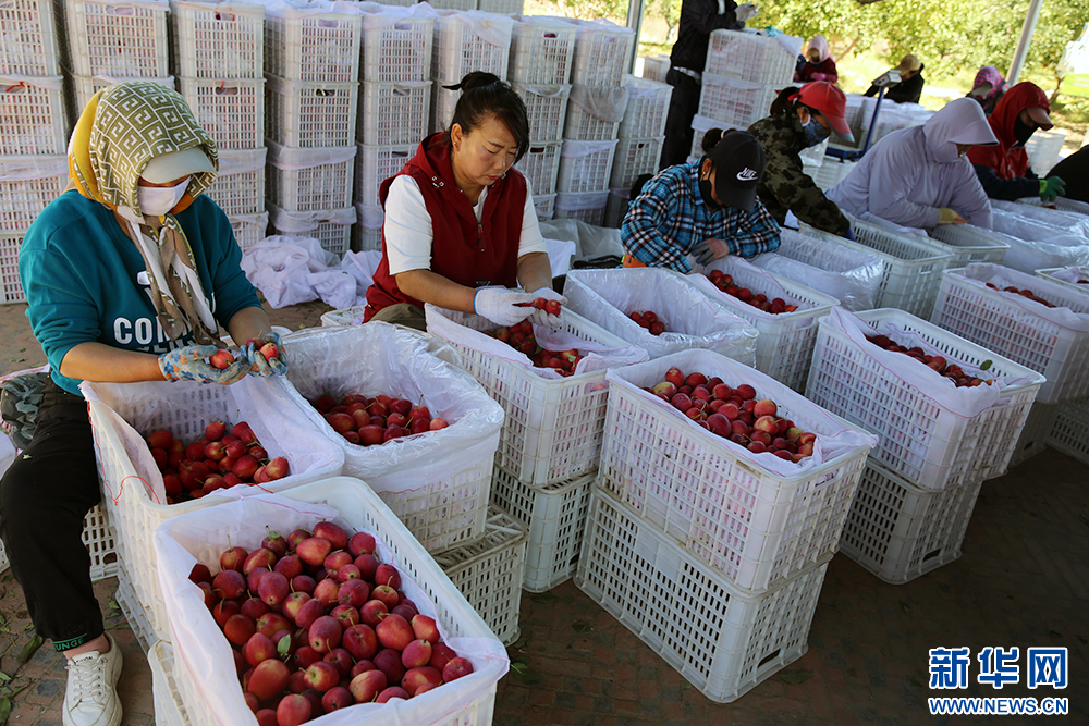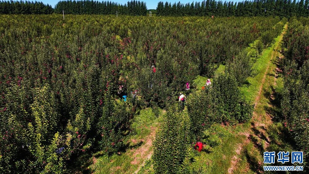 在科尔沁左翼中旗希伯花镇锦绣海棠种植区,果农们在采摘鲜果。新华网发(刘小光 摄)