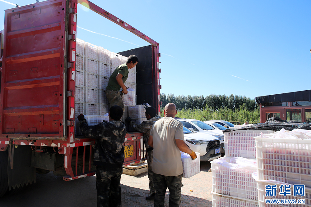 9月12日,在科尔沁左翼中旗希伯花镇锦绣海棠种植区,工人正在将分拣好的锦绣海棠果装车。新华网 石毅 摄