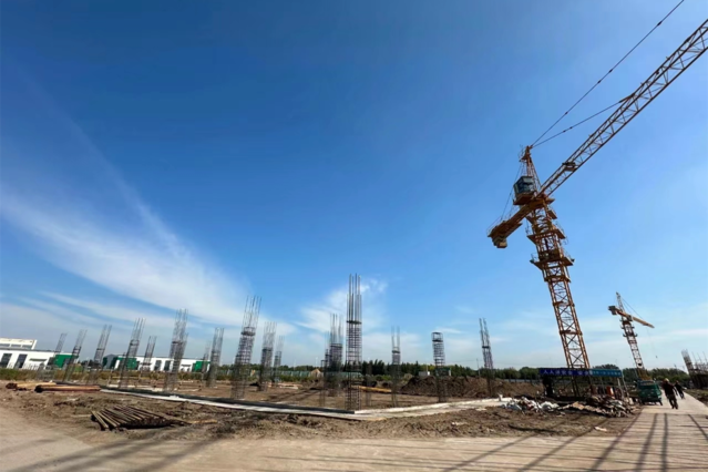 在宇景高科(通辽)智能制造产业园项目施工现场,塔吊林立、机器轰鸣,一派火热的建设场景,工人们正在按照工程节点加紧施工。