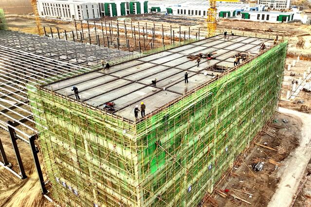 在通辽智能制造产业园项目施工现场,工人们正在抢抓晴好天气加紧施工,全力拉满项目建设“进度条”。“目前5号厂房11月就能封顶,明年开春交付给企业。4号厂房钢结构部分、框架部分也能够完成,6号厂房开槽基础完成,明年10月份全部达到交付标准。”通辽智能制造产业园副总经理郭雄介绍。