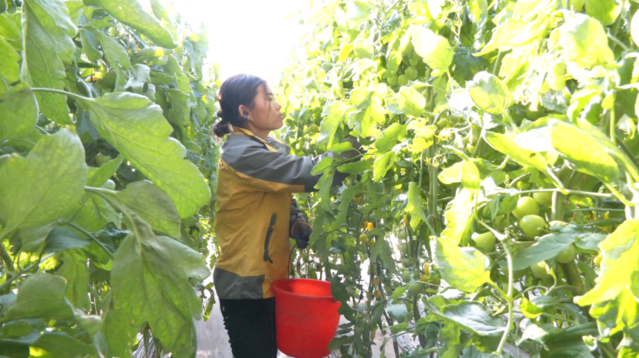 库伦镇南元宝山村蔬菜大棚内的小柿子缀满枝头,种植户任海森正忙着采摘。