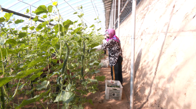 在水泉村设施农业园区,工人正忙着采摘成熟的黄瓜。