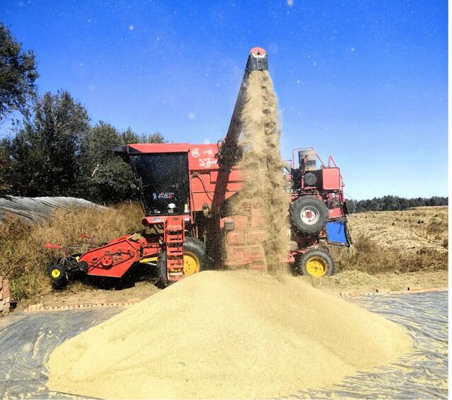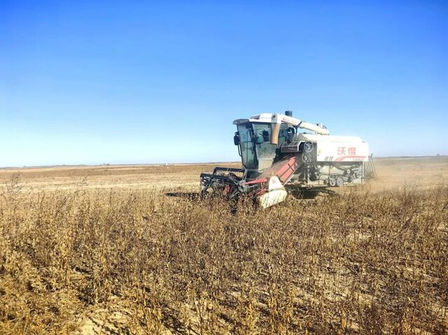 前协力花村旱作高标准农田项目区内的大豆收割进行中。