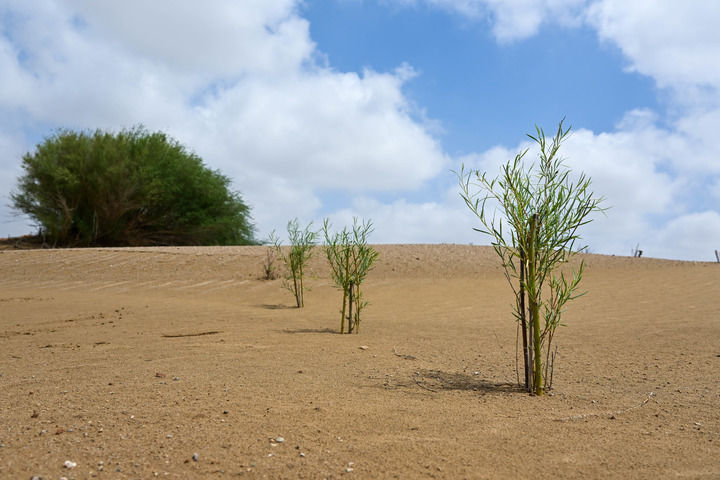 沙漠地区缺水、风沙大,很多植物难以存活,但光伏板吸收太阳光线、遮挡日照,能够有效减少沙化土地和沙漠水分蒸发,降低风速,改善原有天然植物生长的生态环境,提高植被存活率。