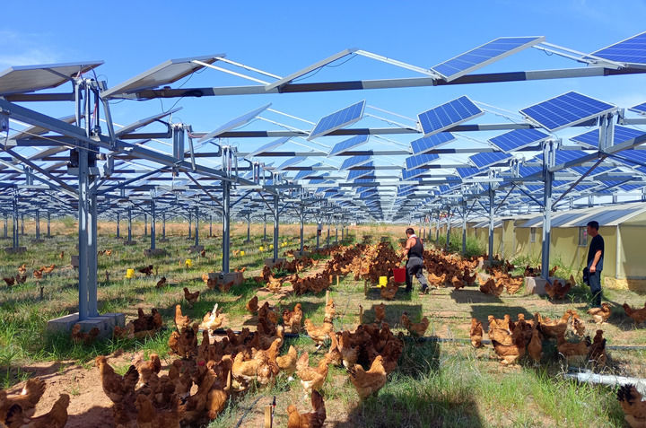 数不清的光伏板汇成一片片“蓝海”在沙漠戈壁中延展,光伏板下,半米高的耐旱耐盐碱沙生植物梭梭将沙土牢牢固定,鸡鸭鹅自在觅食。