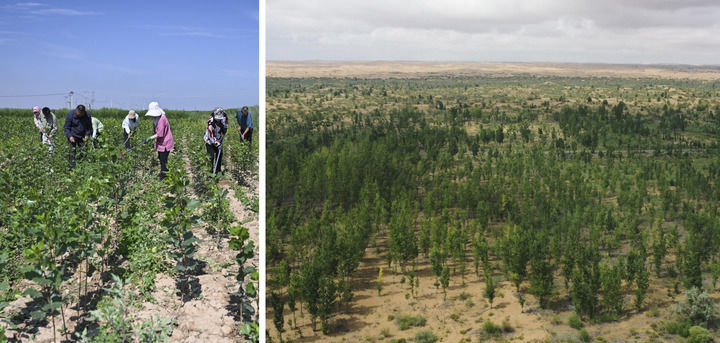 拼版照片:左图为2023年7月22日,内蒙古杭锦旗什拉召治沙站工作人员在苗圃除草;右图为2023年7月22日拍摄的什拉召治沙站种植的库布其沙漠锁边林(无人机照片)。20世纪50年代开始,国营林场什拉召治沙站开始植树治沙,三代治沙人在库布其沙漠北缘营造了长48公里、面积12万多亩的锁边林带,有效遏制了沙漠向北扩张。新华社记者 刘磊 摄