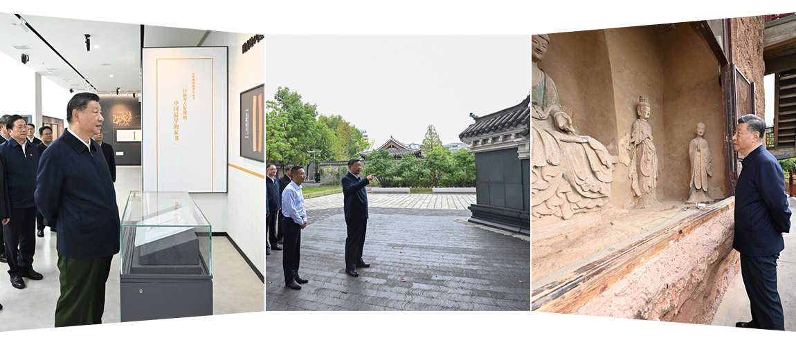 △ 自左向右分别为:2024年11月4日,习近平总书记在湖北孝感云梦县博物馆参观出土秦汉简牍展;2024年10月17日,习近平总书记在安徽桐城六尺巷考察;2024年9月11日,习近平总书记在甘肃天水麦积山石窟考察。