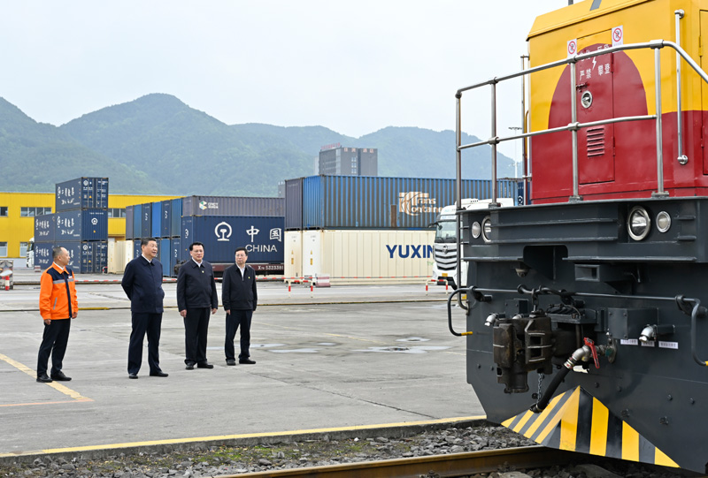 △ 2024年4月22日,习近平总书记在重庆国际物流枢纽园区重庆铁路集装箱中心站考察。