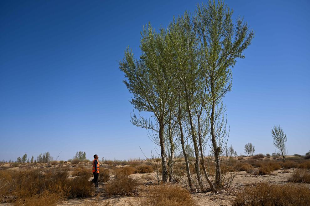 2024年4月11日,一名治沙人在达拉特旗境内的库布其沙漠里巡护树木。新华社记者 李志鹏 摄