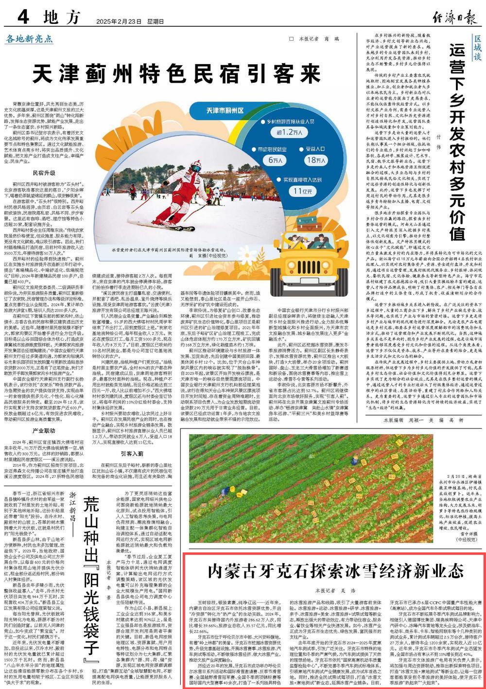 2025年2月23日,《经济日报》第4版刊发题为《内蒙古牙克石探索冰雪经济新业态》的 文章,报道了2024年内蒙古自治区牙克石市共接待国内外旅游者286.62万人次,同比增长39.66%;旅游业总收入35.57亿元,同比增长22.66%。