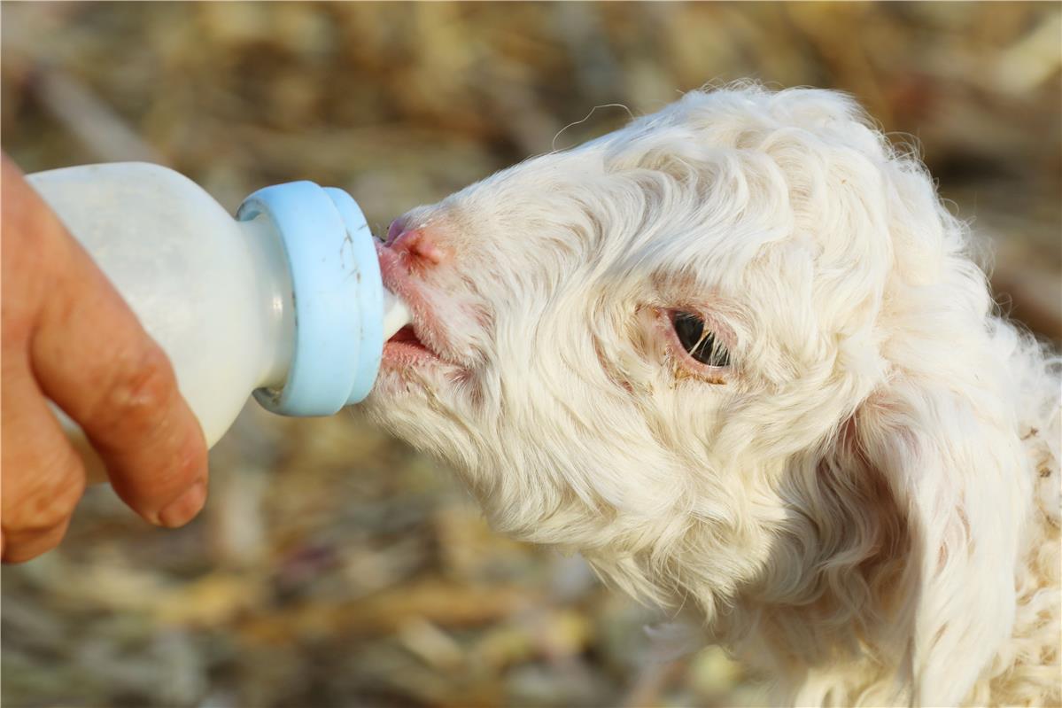 对羔羊进行人工哺乳。