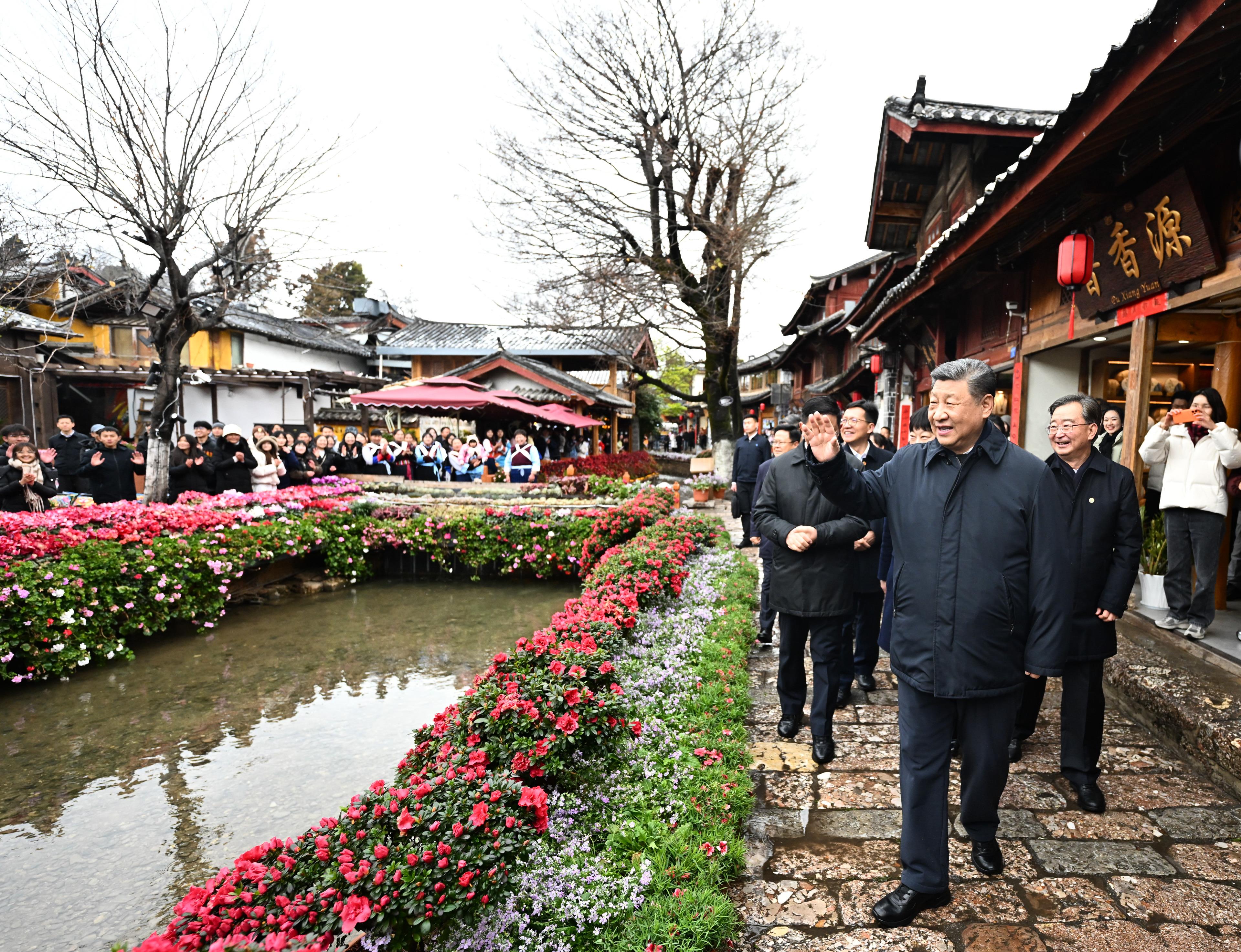 △2025年3月19日,习近平总书记在云南丽江古城考察时,与居民、游客互动交流。