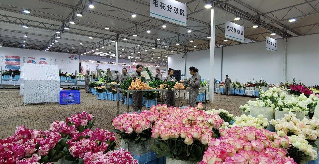 △云南丽江现代花卉产业园内,工人正在分类整理鲜花。