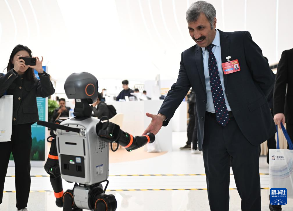 3月27日,与会嘉宾与一款加速T1机器人握手。